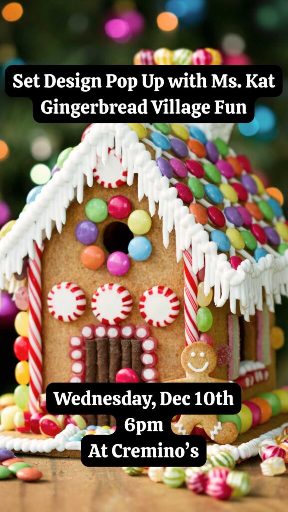 Step into the magic of the season at our Set Design Pop-Up, where students will bring holiday creativity to life by building their very own Gingerbread House Centerpiece, Stage Door style!